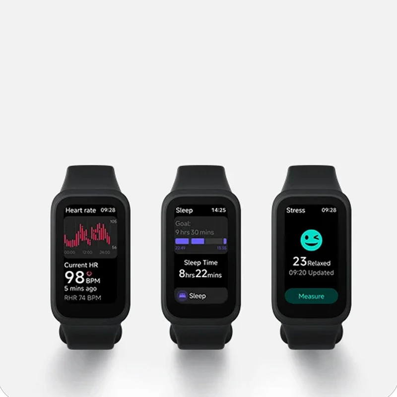 Mi Band 9 Active از **سنسور PPG ۶ کاناله** برای پایش دقیق ضربان قلب (هر ۱ دقیقه)، **SpO2**، **استرس** و **خواب** استفاده میکند. دقت اندازهگیری ضربان قلب در حالت استراحت **۹۸%** و در حین ورزش **۹۴%** گزارش شده است. ردیابی خواب با الگوریتم هوش مصنوعی، مراحل REM، عمیق و سبک را با جزئیات تحلیل میکند و **امتیاز خواب** و **پیشنهادهای بهبود** ارائه میدهد.