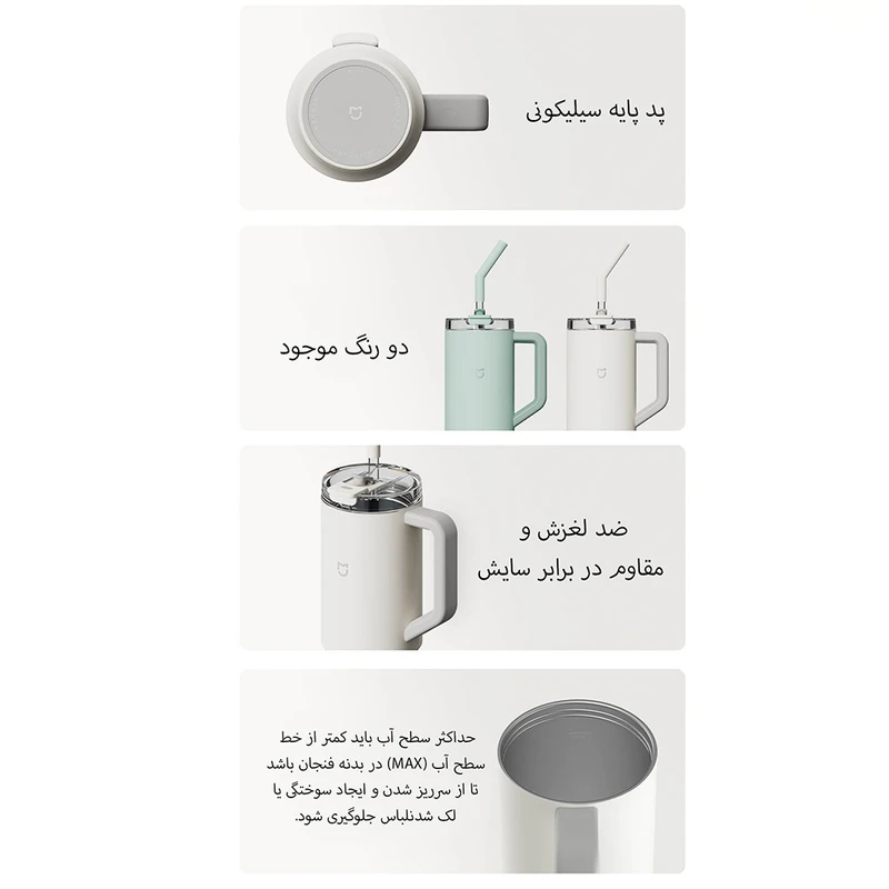 - **نشتی احتمالی**: اگر درب کامل بسته نشود یا ماگ افقی قرار گیرد، ممکن است کمی نشت کند.