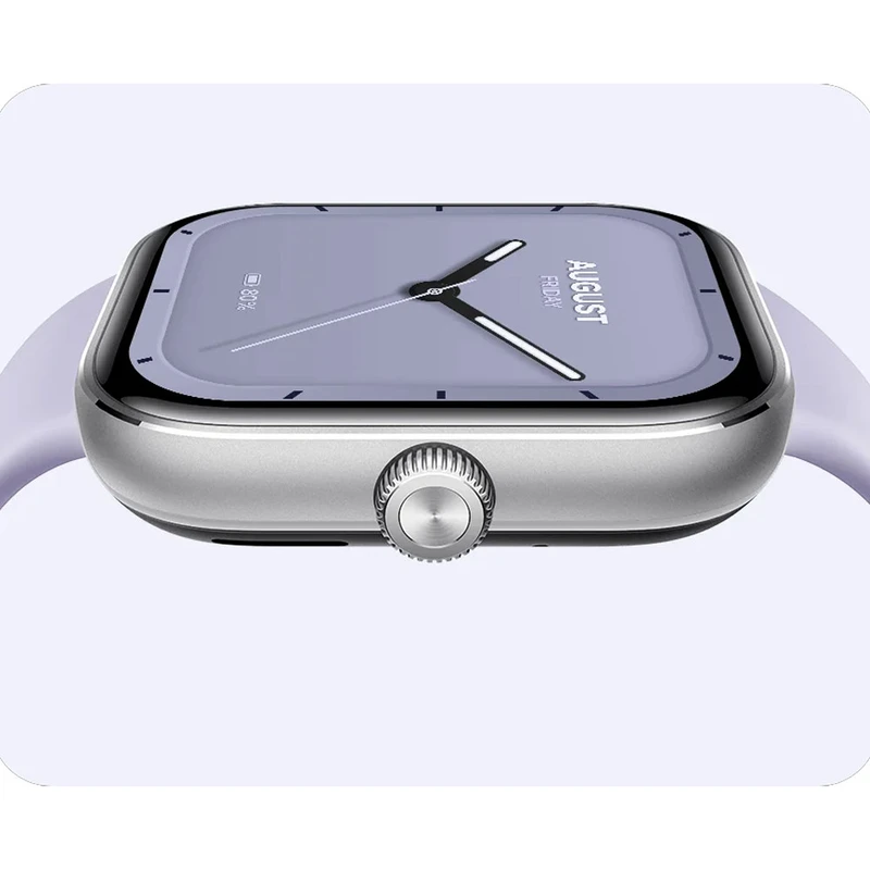 Redmi Watch 5 با بدنه مستطیلی (۴۶.۴ × ۳۹.۱ × ۱۱.۴ میلیمتر) و فریم آلومینیومی مات، ظاهری مدرن و نزدیک به اپل واچ دارد. وزن ۳۵ گرمی (بدون بند) و بندهای سیلیکونی ۲۲ میلیمتری قابل تعویض (در رنگهای مشکی، نقرهای، آبی و سبز زیتونی) آن را برای مچهای متوسط تا بزرگ مناسب میکند. دو دکمه فیزیکی در سمت راست — یکی چرخان (Rotating Crown) برای اسکرول روان و دیگری برای دسترسی سریع به منو — تجربه کاربری را ارتقا دادهاند.